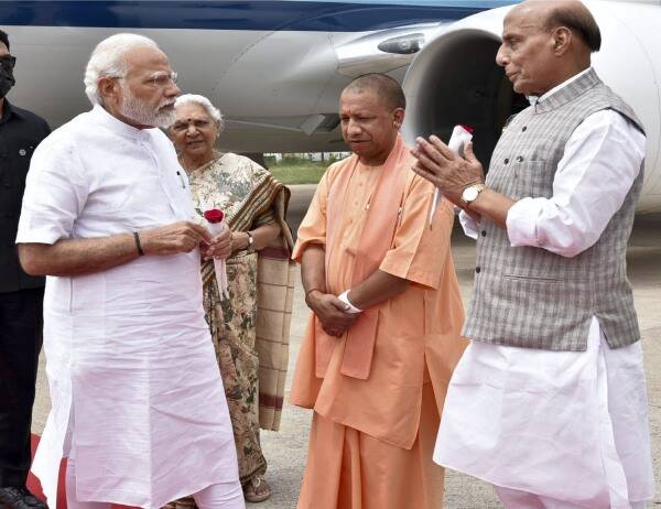 Lucknow: Prime Minister Narendra Modi being welcomed by Defence Minister Rajnath Singh upon his arrival to inaugurate the Ground Breaking Ceremony @3.0 of the UP Investors Summit, in Lucknow. (PTI)