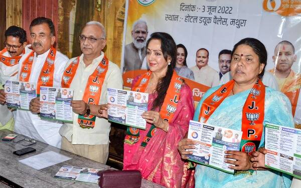 BJP MP & Bollywood actress Hema Malini during ‘Report to Nation Programme’ of BJP on completion of eight years of Prime Minister Narendra Modi’s government, in Mathura, Friday, June 3, 2022. (PTI Photo)