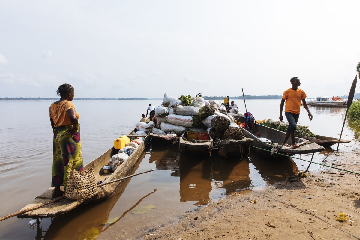 Traders load motorized canoes with goods to be transported to Kisangani, an eight-hour trip.