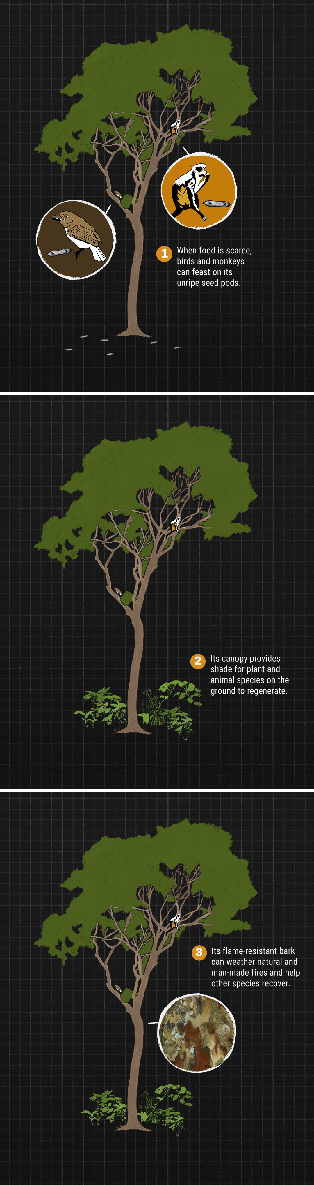 This, then, might be Afrormosia’s sustainable future: Populations of trees large enough to withstand controlled logging, and successful enough at regenerating to quickly replace those lost. In a modern era of population growth and spiraling demand for resources, successful cultivation for commercial exploitation and restorative conservation might harness and multiply Afrormosia’s remarkable resilience.