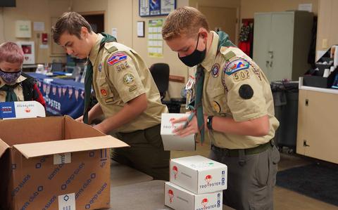 Boy Scouts assemble care packages for overseas troops at a VFW post in Mechanicsburg, Va., in November. The pandemic’s disruption of the global supply chain is making it more challenging to obtain items for care packages and send them to bases abroad. (Troopster)