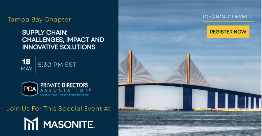 TAMPA, FL, UNITED STATES, April 28, 2022 /EINPresswire.com/ — The Tampa Bay Chapter of the Private Directors Association (PDA), a national association dedicated to serving private company boards and directors with the mission of improving value, growth, and sustainability through private company board excellence, is pleased to present a discussion on “Supply Chain: Challenges, Impact, and Innovative Solutions.”