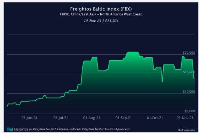 Asia-North America West Coast rates fell 26 percent this week to $13,924/FEU. Rates are nearly 30 percent higher than their level just before the July spike, 261 percent higher than a year ago and 9X more than in November 2019.