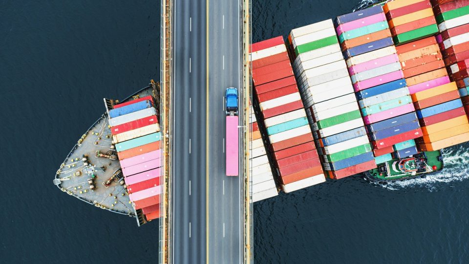 Aerial view of a container ship passing beneath a suspension bridge. Semi truck with pink cargo container crosses above.