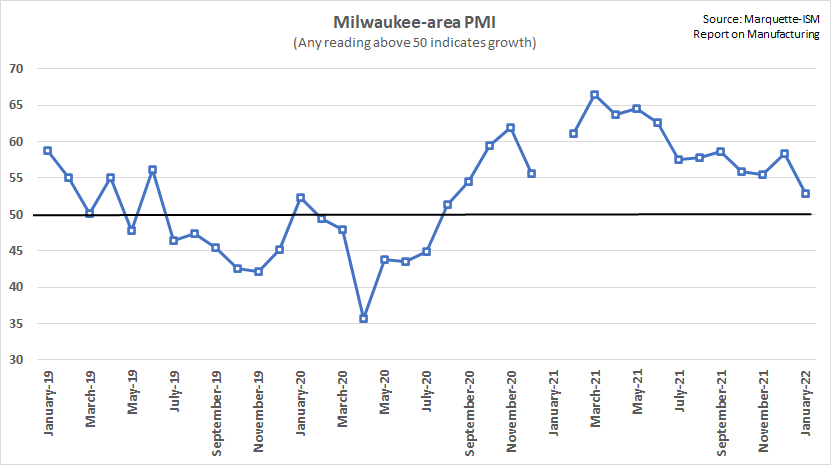 The report’s Milwaukee-area PMI for January was 52.86, down from 58.28 in December. A reading above 50 suggests the region’s manufacturing sector is growing.