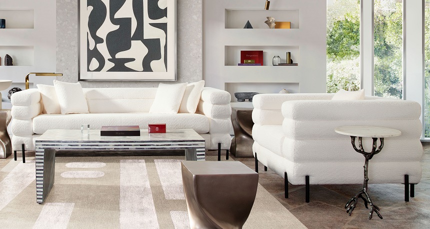 Diamond Sofa, B-746 offers its Vox sofa and chair in textured white faux shearling fabric.