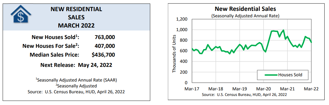 The U.S. Census Bureau and the U.S. Department of Housing and Urban Development have announced their new residential sales breakdown for March 2022, where sales of new single‐family houses hit a seasonally adjusted annual rate of 763,000. Sales were 8.6% below the revised February rate of 835,000, and 12.6% below March 2021’s estimate of 873,000 new home sales nationwide.