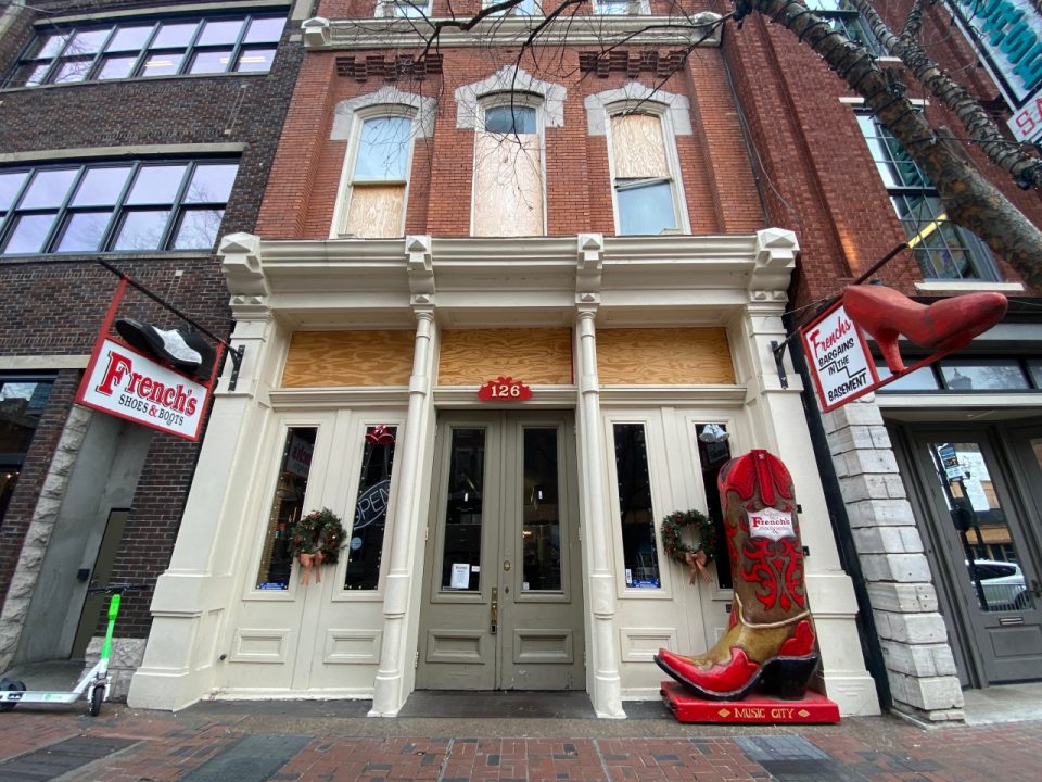 NASHVILLE, Tenn (WKRN) — The 2020 Christmas Day bombing in downtown Nashville shattered several windows at French’s Shoes and Boots on 2nd Avenue. Nearly one year later, they are still waiting to have new glass installed.