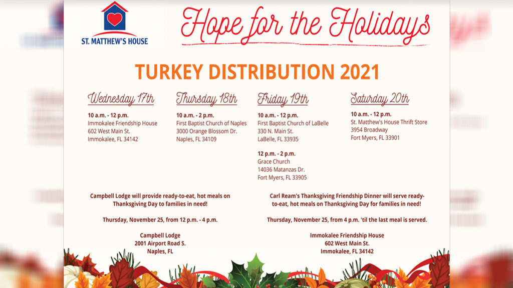 COLLIER COUNTY, Fla. — The demand for Thanksgiving meals is so high this year, even food assistance organizations like St. Matthew’s House were affected. Ahead of its “17th Annual Hope for the Holidays” turkey distribution event, the non-profit dealt with ingredient shortages and supply chain issues.