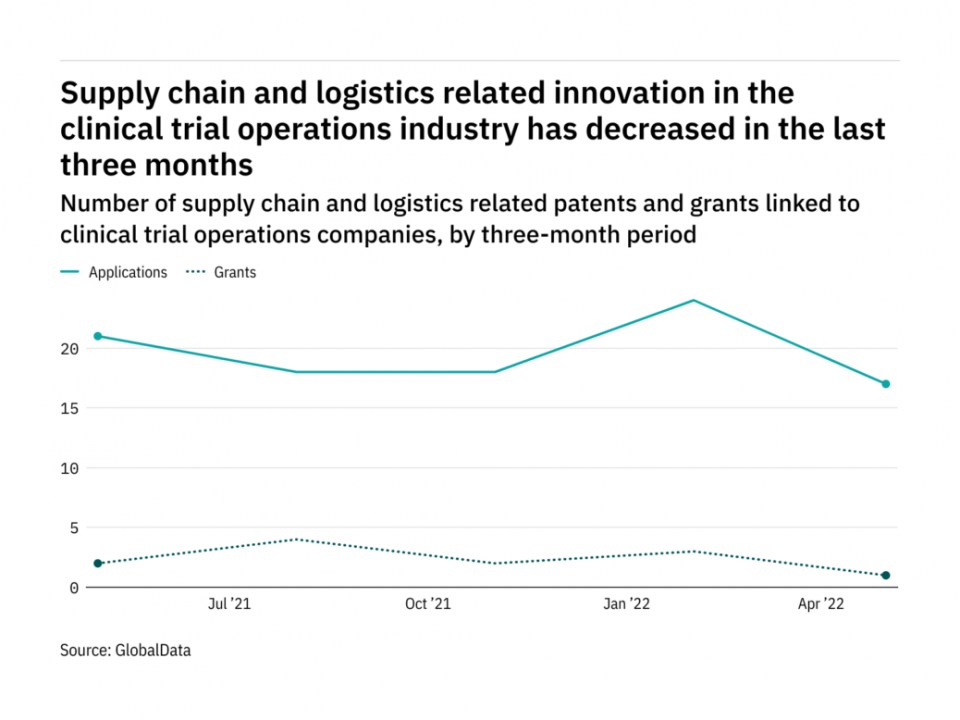 Research and innovation in supply chain & logistics in the clinical trial operations sector has declined in the past three months ending May.