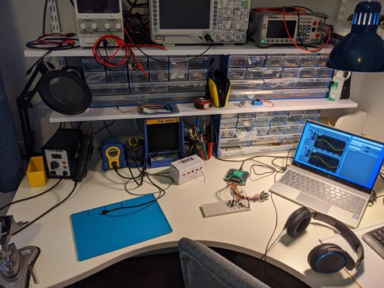 Carlos and Adam consider themselves to be lucky to have received their Analog Discovery 2s before the coronavirus crisis commenced. By comparison, the two images below show the home workbenches of Nicholai Dimech and Jean Callus who are both students at the University of Malta. One thing that is conspicuously absent from both pictures are their Analog Discovery 2 units, which are currently on backorder.