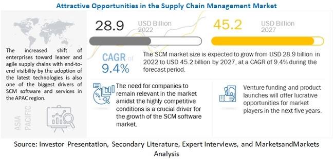 According to a new market research report “Supply Chain Management (SCM) Market by Component (Hardware (Barcode and Barcode Scanners, and RFID Tags and Readers), Software, and Services), Deployment Mode (Cloud and On-premises), Organization Size, Vertical and Region – Global Forecast to 2027” published by MarketsandMarkets™, the global Supply Chain Management market size is projected to grow from USD 28.9 billion in 2022 to USD 45.2 billion by 2027, at a Compound Annual Growth Rate (CAGR) of 9.4% during the forecast period.