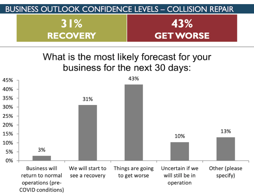 That is notably more optimistic than mechanical service shops (41% expecting early signs of recovery) and collision repair shops (31%).