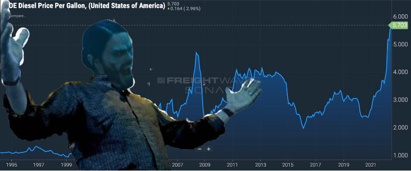 Suckin’ the blood out of your wallet — Trucks can’t move without fuel and moving trucks has gotten significantly more expensive as the year has gone on. While the national average DOE Diesel Price Per Gallon is over $5.70, many areas have reported much higher signs at the pump. Just to add some insult to injury: Dry van spot rates are down a penny this week ::facepalm::