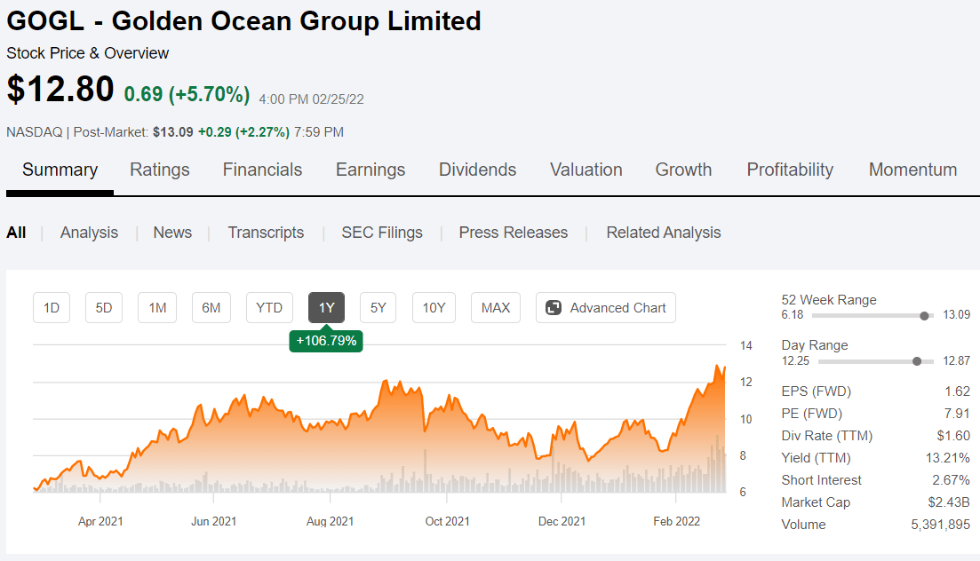 My pick for the dry bulk shipping sector is Golden Ocean Group Limited (GOGL). With both Panamax and Capesize vessels in their fleet, GOGL took advantage of the higher TCE (Time Charter Equivalent) rates they were able to realize when they reported Q42021 results on February 16, 2022, leading to earnings of $1.02 per share – the best in the company’s history. The company has no debt maturities before 2023 and reported $243.5M in adjusted EBITDA in Q42021 compared to $229.7M in Q3 with $210M in cash at the end of 2021.