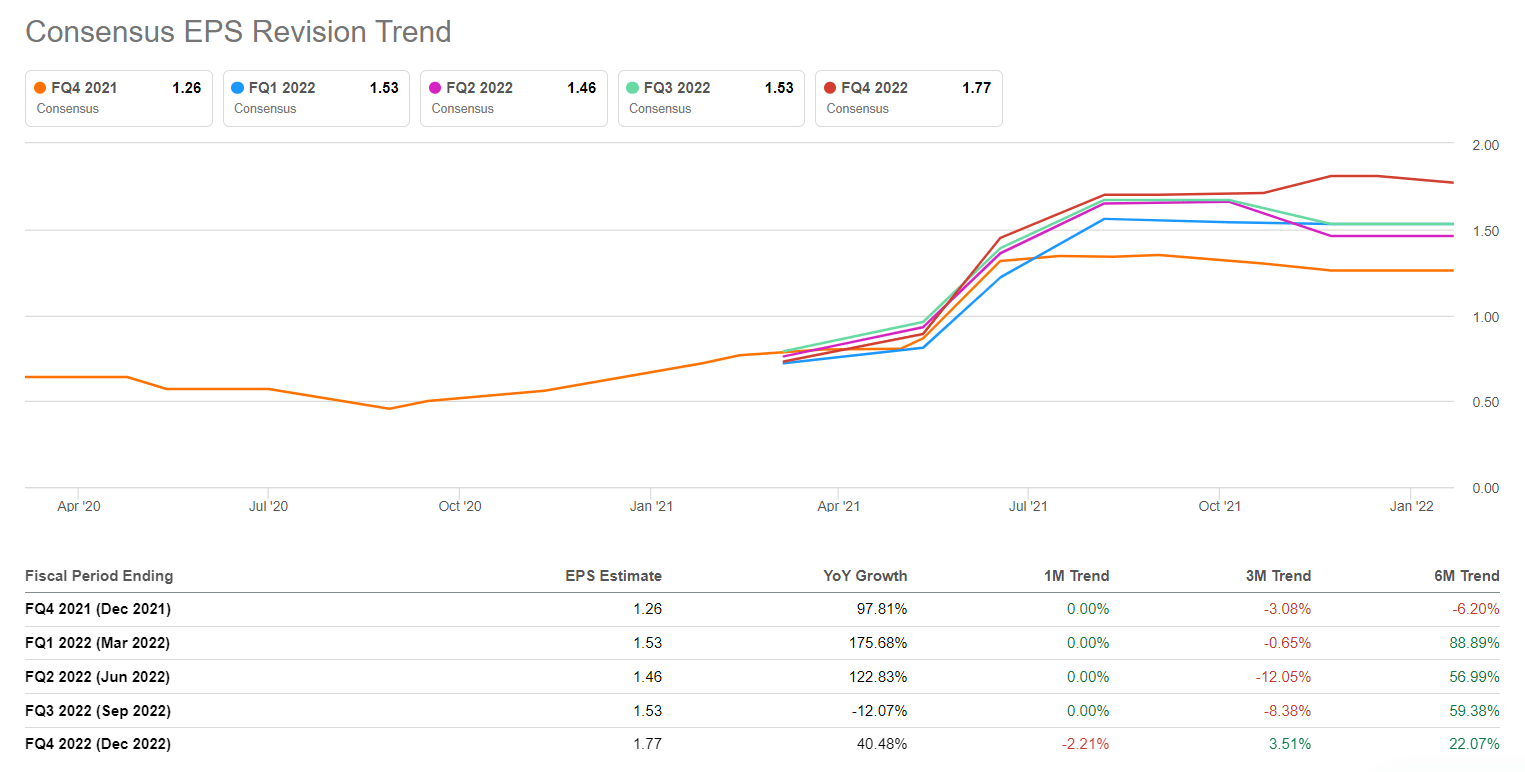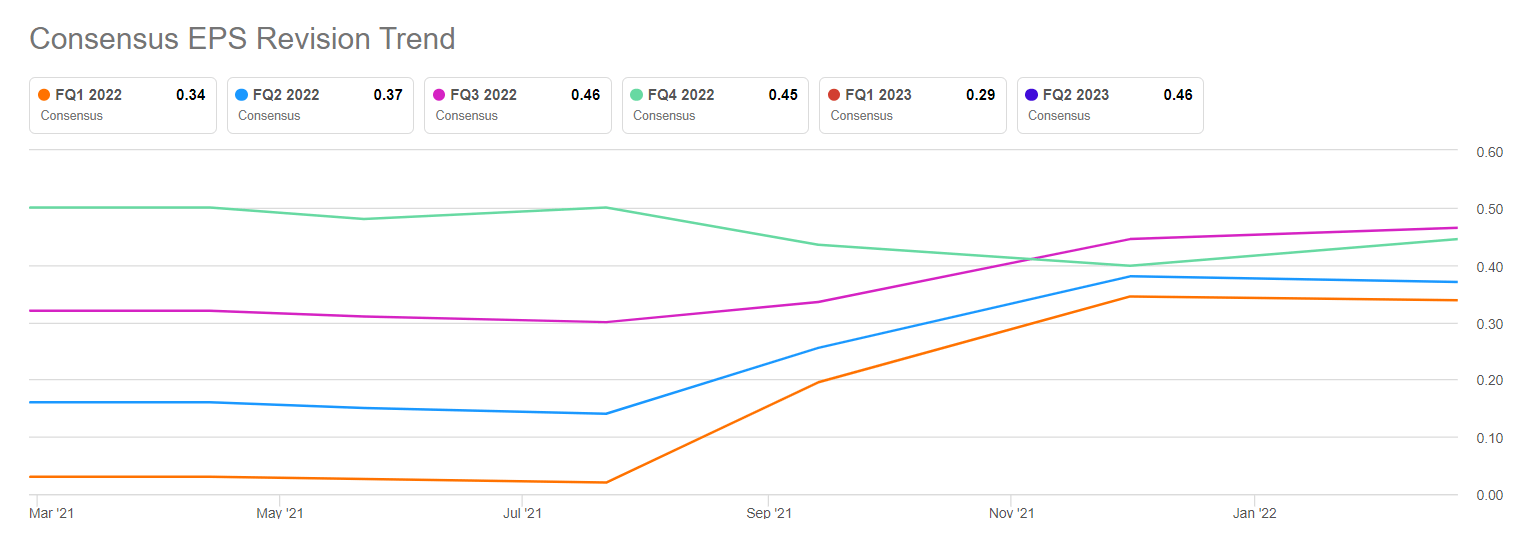 The earnings trend for FY22 shows an expected increase over the next 6 months continuing unabated. On March 2 the Q42021 earnings will be reported, and consensus non-GAAP estimates range from $1.15 to $1.37. In November, the average consensus estimate was $0.95, and the company reported $1.74, so I would not be surprised if the Q4 consensus estimate is also lower than what will be reported.
