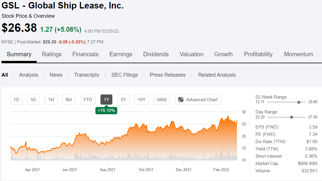 In an article published in October 2021, SA contributor J Mintzmyer called GSL his top pick in the container sector. Although the share price has increased about 76% over the past year, it still trades at a good value with a forward P/E of 7.34 and pays a 4% dividend on top.