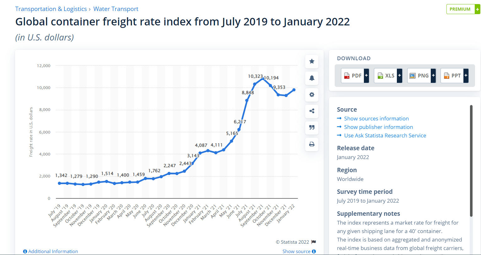 On the other hand, the shipping industry is one part of the global economy that has been realizing economic benefits from the ongoing supply chain disruption. From container ships to dry bulk, and integrated shipping/logistics, many shipping stocks have seen increasing revenues and higher margins. For example, container rates have been rising since early 2020 and especially in 2021 as shown in the chart below from Statista.