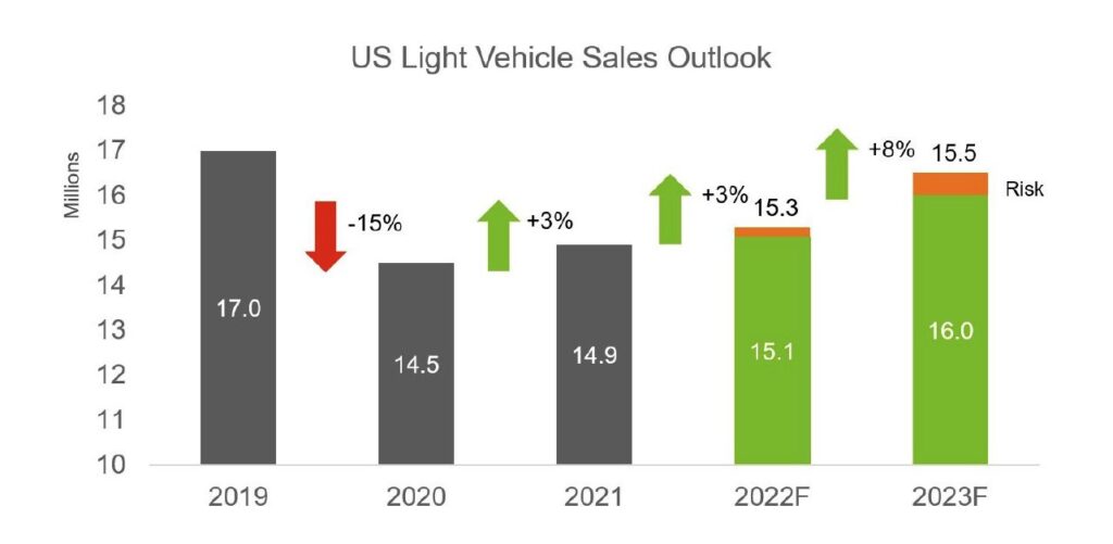 LMC has cut the outlook for US light vehicle sales in 2022, given the recovery is expected to be hampered by lack of inventory. Volume is now expected to finish the year at 15.3 million units, down by 500,000 from last month. The recovery pace is now expected to be slower than it was at the beginning of the year. Q1 North American production levels are likely to be about 50,000 units lower than we expected last month and periodic downtime and slower line rates continue to keep supply constrained.