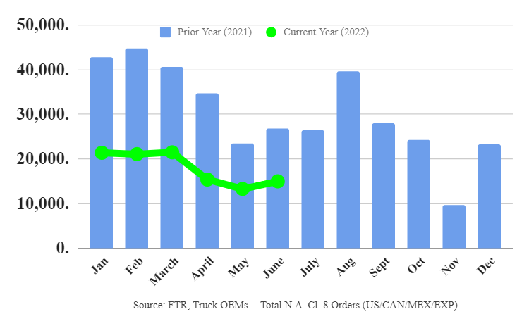 June’s order total was in line with the previous three months. FTR says manufacturers are still struggling to procure semiconductors, tires, and other key components, limiting production.