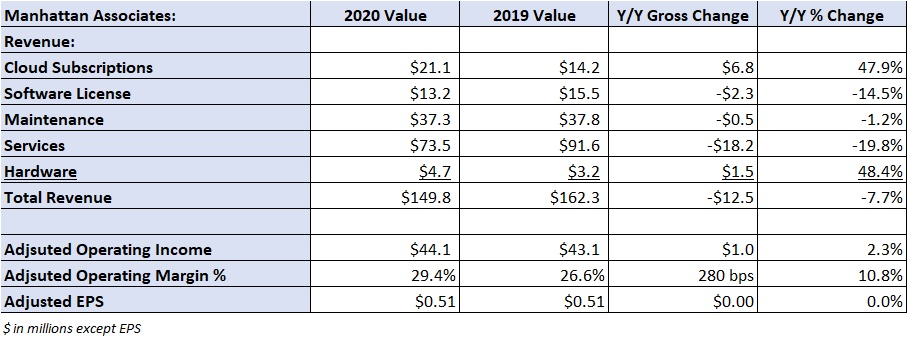 “This was a strong quarter for Manhattan Associates, despite the continued impact that the COVID-19 pandemic is having globally. Our cloud business continues to trend positively as more and more customers look for modern, agile and scalable supply chain and omnichannel commerce solutions to help them operate in a rapidly evolving world,” said President and CEO Eddie Capel.