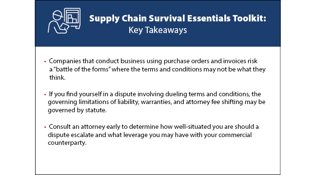 The above scenarios are certainly not the only situations where a Battle of the Forms analysis can significantly alter the legal framework applied to a dispute between contracting parties. However, given how limitations of liability, warranty claims, and attorneys’ fees can impact a dispute, parties should pay close attention to these issues if they spot a potential Battle of the Forms situation, and consult with an attorney to understand how these issues impact their decision making.