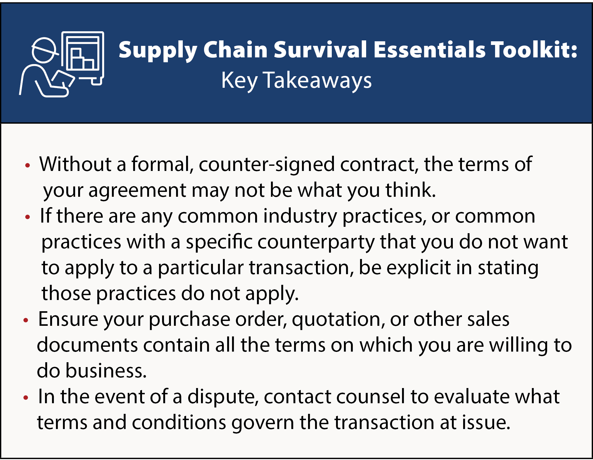 After working through two different customer disputes in as many weeks, you finally come up for some air. While you have the opportunity, you decide it is time to review ABC Corp.’s contracting practices for buying and selling materials and products. After experiencing how easily contracts are formed and the risk of unintentionally forming a contract, you decide to ask your lawyer for guidance on how to determine what contract terms apply when parties do form a contract. The lawyer tells you that the answer depends on how the parties entered into the contract. Did they exchange purchase orders (“POs”) and quotes? Did they sign an express contract? Did they begin to perform the contract or operate based on past performance or trade usage?