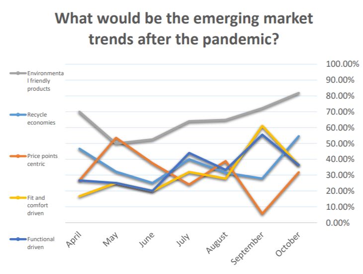 Alongside trimming perceived expendable links in the supply chain, environmental trends continue to dominate the agenda; 80% expressed that they were making efforts to become more sustainable. On the flipside of that, price point driven product demand rose and functionally driven goods design decreased.