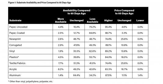 Our survey confirms that the crisis is getting worse. For every substrate covered, reports that availability has decreased over the past 60 days far exceed reports of the opposite, with the highest percentages reporting declines in the availability of coated paper (84.8%), uncoated paper (79.2%), vinyl (62.6%), and plastics other than vinyl (55.7%). Moreover, majorities ranging from 96.7% for coated paper to 74.4% for textiles/fabrics and newsprint report prices continue to rise (see Figure 1).