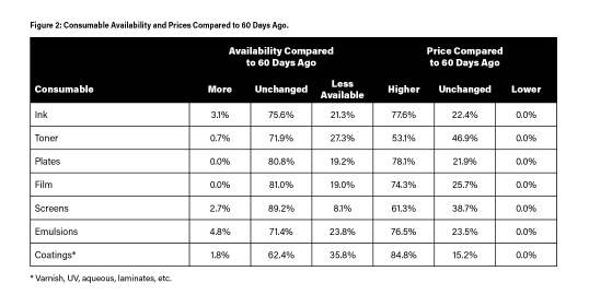 For every consumable covered, majorities report supply has not diminished during the past two months, but is still tight enough to push prices higher. The most widely reported increases are for coatings (84.4%), plates (78.1%), and ink (77.6%) (see Figure 2).