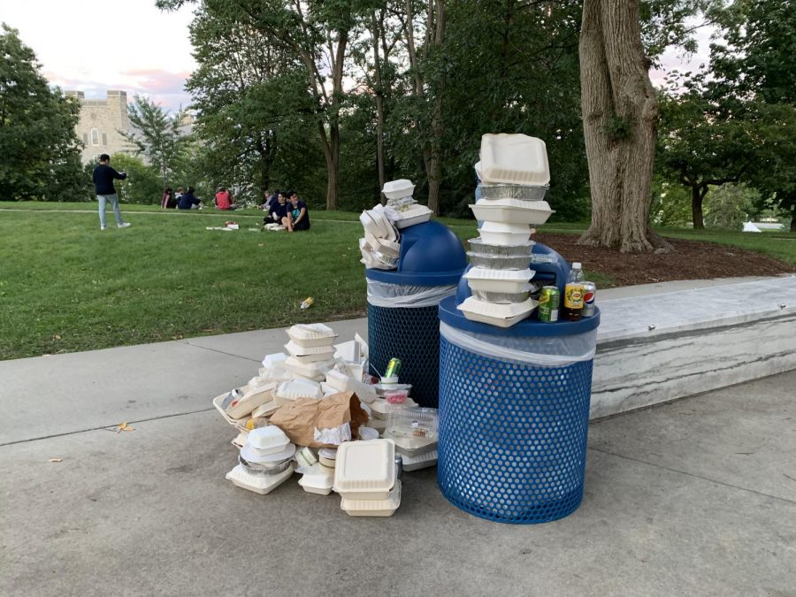 This semester, the dining halls look very different. Instead of clattering metal cutlery and conveyor belts of dishes stacked waiting to be washed, students spent the first week back on campus stuffing compostable containers and leftovers into overflowing recycling bins outside. The bench outside Proctor, empty of the usual groups of students chatting and eating side by side, is now filled with stacked boxes, empty sandwich containers and soda cans. Now, a couple of weeks into the semester, students discard their trash in dumpsters outside of each of the dining halls, careful to avoid the bees and wasps flitting in and out of the accumulating waste.