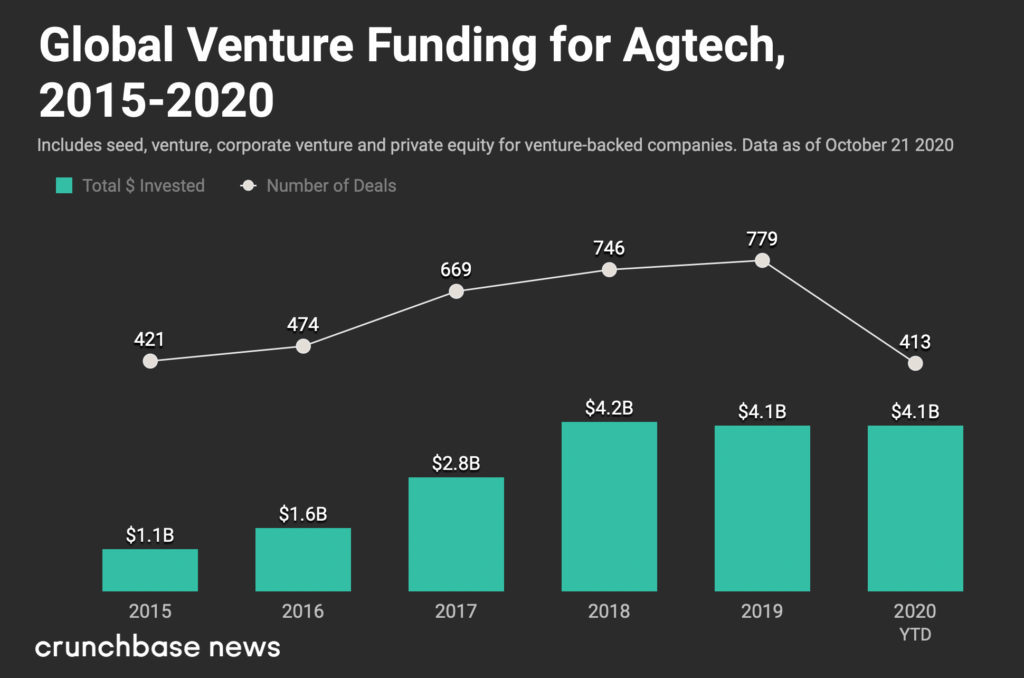 And that’s when farmers look to innovation. In the past five years, startups have increasingly turned their attention to the farm, and investors are following their lead. So far in 2020, investors have sunk $4.1 billion of venture-backed dollars into 413 agriculture technology deals, and over the last five years have made $17.7 billion in investments, according to Crunchbase data.