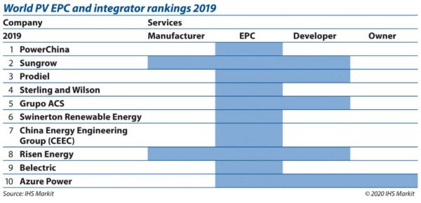 In 2019, PowerChina installed 2.5 GW of PV to sail to the top of IHS Markit’s global EPC providers ranking, from fourth position in 2018. This was made possible by installing 1 GW in China, another 1 GW in Vietnam, and several projects in Latin America.