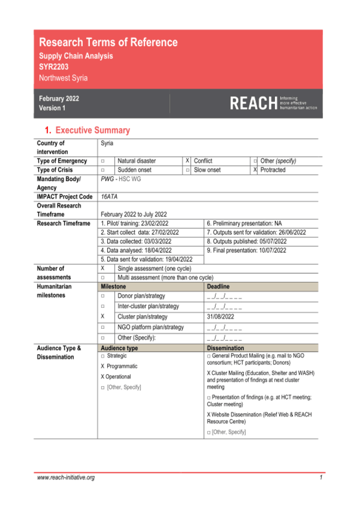Syria: Research Terms of Reference – Supply chain analysis SYR2203, Northwest Syria (February 2022, Version 1) – Syrian Arab Republic