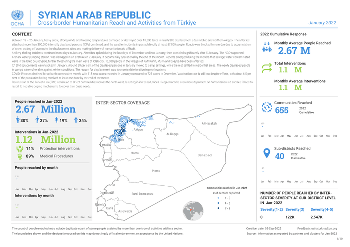 Between 18 – 25 January, heavy snow, strong winds and freezing temperatures damaged or destroyed over 10,000 tents in nearly 300 displacement sites in Idleb and northern Aleppo. The affected sites host more than 300,000 internally displaced persons (IDPs) combined, and the weather incidents impacted directly at least 57,000 people. Roads were blocked for one day due to accumulation of snow, cutting off access to the displacement sites and making delivery of humanitarian aid difficult.