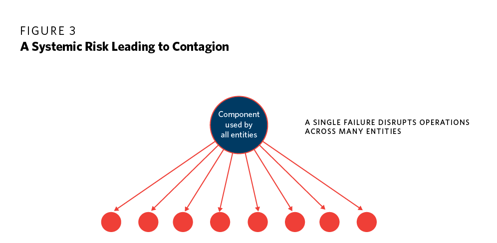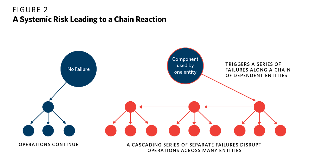 The concept of “systemic cyber risk” is grounded in the broader idea of “systemic risk”—the possibility that a single event or development might trigger widespread failures and negative effects spanning multiple organizations, sectors, or nations.7 Well-known systemic shocks with global consequences have included the 2008 financial crisis, the COVID-19 pandemic, and recent supply chain disruptions. These events illustrate how various forms of interdependency—whether financial, biological, logistical, digital, or otherwise—can increase volatility in large-scale systems by boosting the chance that any given failure will spread, often in unexpected ways (see figure 1).