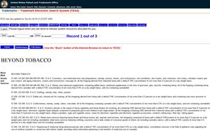TESS record on the USPTO trademark search engine for the Company’s Beyond Tobacco™ trademark application in the United States (88956478)