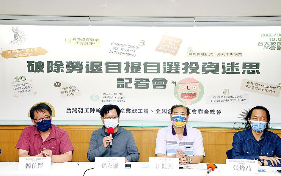 Taiwan Federation of Financial Unions secretary-general Han Shih-hsien (韓仕賢) said that the new pension fund scheme aims to ensure that workers can maintain a basic living standard when they retire, and that the goal of managing the pension fund is to make sure it grows “stably and conservatively.”