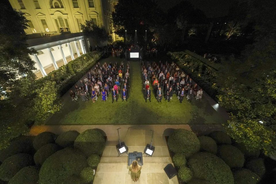 The use of the White House as backdrop continued when First Lady Melania Trump capped off the evening with a speech from the newly renovated Rose Garden.