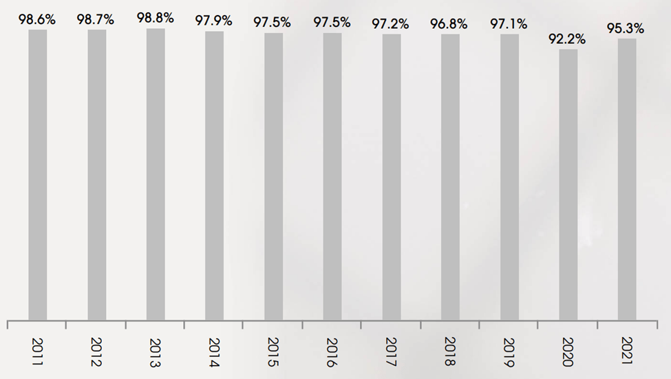 Also encouraging, tenant sales per square foot have also solidly rebounded by 17.6% from 2019-levels to $468, indicating that the outlet model is durable and moving beyond the challenges it faced even prior to the start of the pandemic. As shown below, SKT’s occupancy is now nearly in line with that of pre-2020 levels.