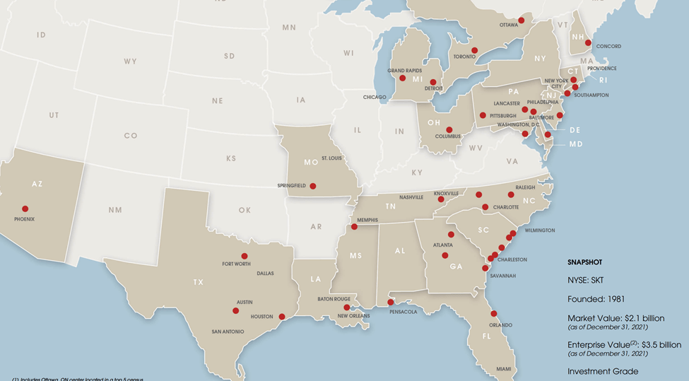 Tanger Factory Outlet is the nation’s largest pure-play outlet center REIT, with 36 centers spread across 20 states and Canada, covering 2,700 stores leased to 600 different brand name companies.