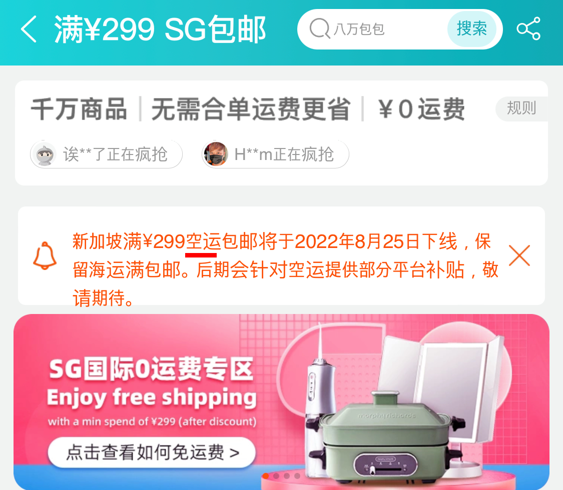 “Our 299 yuan free shipping [promotion] by air for Singapore [addresses] will end on Aug. 25, 2022.”