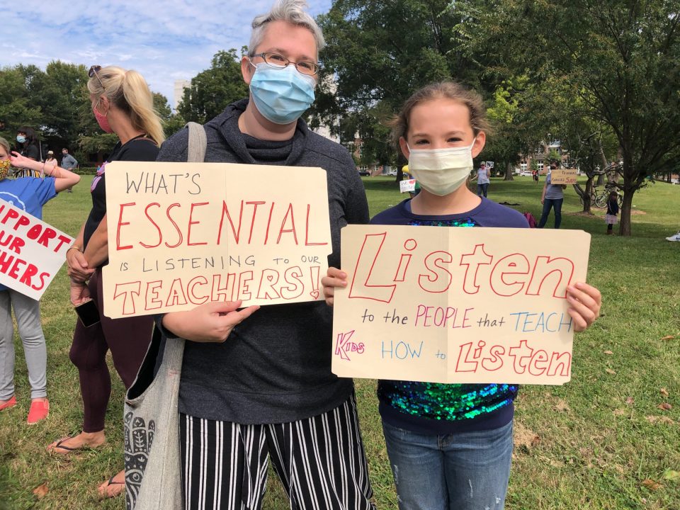 Keri Shaya and her daughter holding a sign reading, “We love teachers.” Photo by Alex Brown