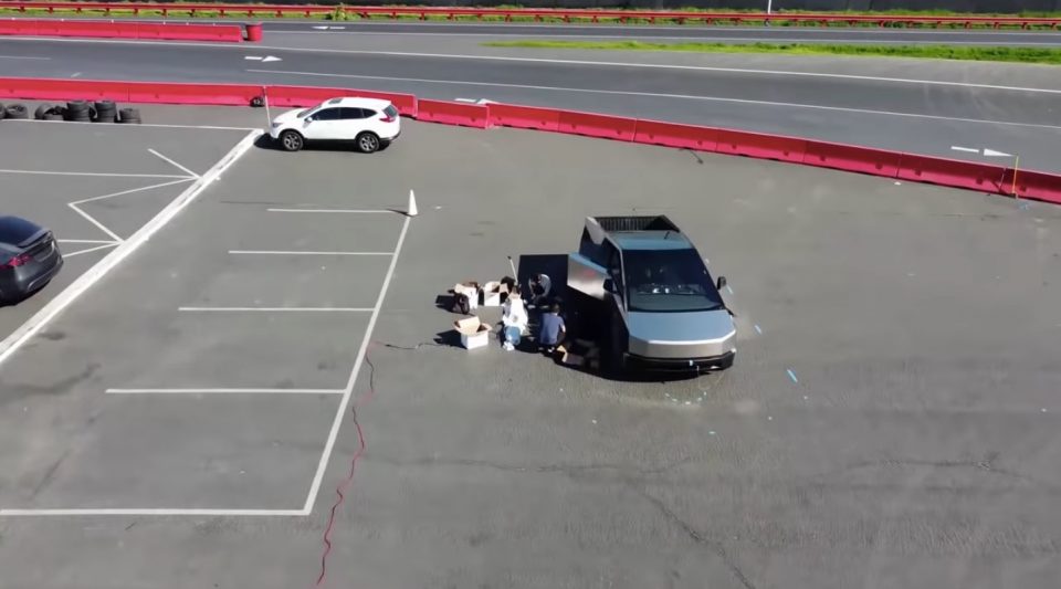 The Cybertruck prototype was spotted near the Fremont Factory’s test track, hinting at the purpose of its visit. Several people could be seen near the electric pickup truck, tinkering here and there around it.