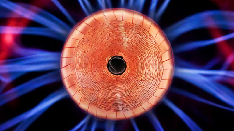 Tesla’s new larger 4680 (46mmx 80mm) battery cell showing the coiled layers inside that contain the cathode, anode, & separator