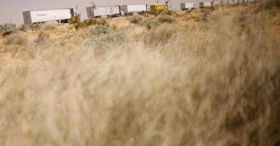 Trucks wait in a queue to cross into the United States as Mexican truck drivers block the Jeronimo-Santa Teresa International Bridge connecting the city of Ciudad Juarez to Santa Teresa, Nuevo Mexico, to protest truck inspections imposed by Texas Governor Greg Abbott, in Ciudad Juarez, Mexico April 12, 2022. REUTERS/Jose Luis Gonzalez