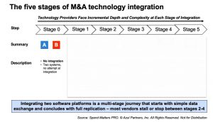 Today, we introduce and define the five levels of M&A technology integration, where Stage 0 is no integration at all. And we’ll explain why the five stages matter, starting first with establishing a reference framework for customers, vendors, consultants and investors.