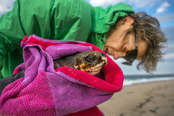 The phenomenon is the largest recurring sea turtle stranding event in the world. While it’s natural—local records of sea turtle bones date back centuries—the scale is new and may, paradoxically, be a product of successful efforts to recover Kemp’s ridley populations, in addition to the effects of climate change. “This area is increasing in water temperature faster than 99 percent of water bodies in the world,” says Kate Sampson, coordinator for sea turtle stranding and disentanglement at the National Oceanic and Atmospheric Administration (NOAA), where she helps coordinate turtle transport. “Because of that, it seems like it’s drawing more sea turtles.”