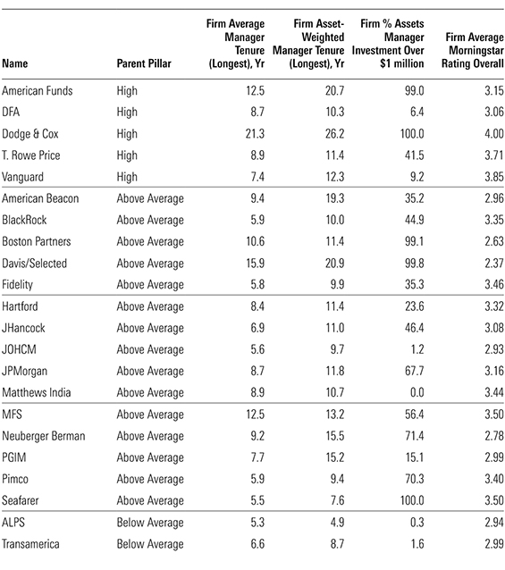 And when that manager does retire or leave, a good fund company will have a better bench to turn to for a replacement. Witness each of our highly rated firms and you’ll see that manager transitions are far better than typical of the industry. Often, we keep a Morningstar Medalist rating on a fund after a change at these firms; that is much less likely to happen at a fund with an Average parent.