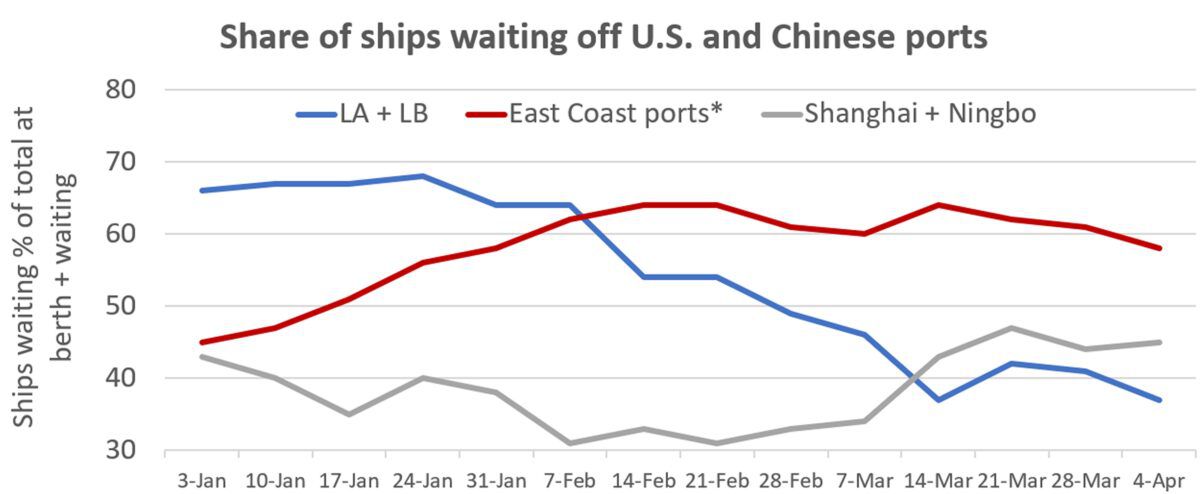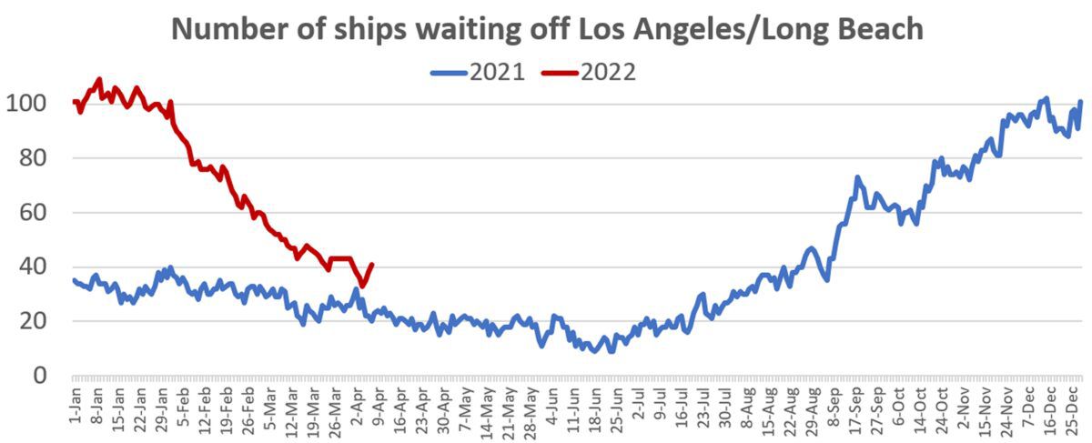 Spot rates are heavily affected by port congestion. There were just 41 container ships waiting for berths in Los Angeles and Long Beach on Thursday, sharply below the all-time high of 109 on Jan. 9.
